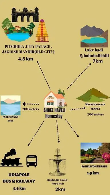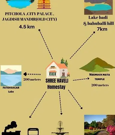 Jagdish Tapınağı'dan 3 km mesafede konumlanan Shree Haveli Homestay dairesinin 24-saat güvenlik, döviz bürosu gibi birçok olanağı vardır. Daire, Pichola Gölü'a arabayla 10 dakikalık mesafede bulunur.